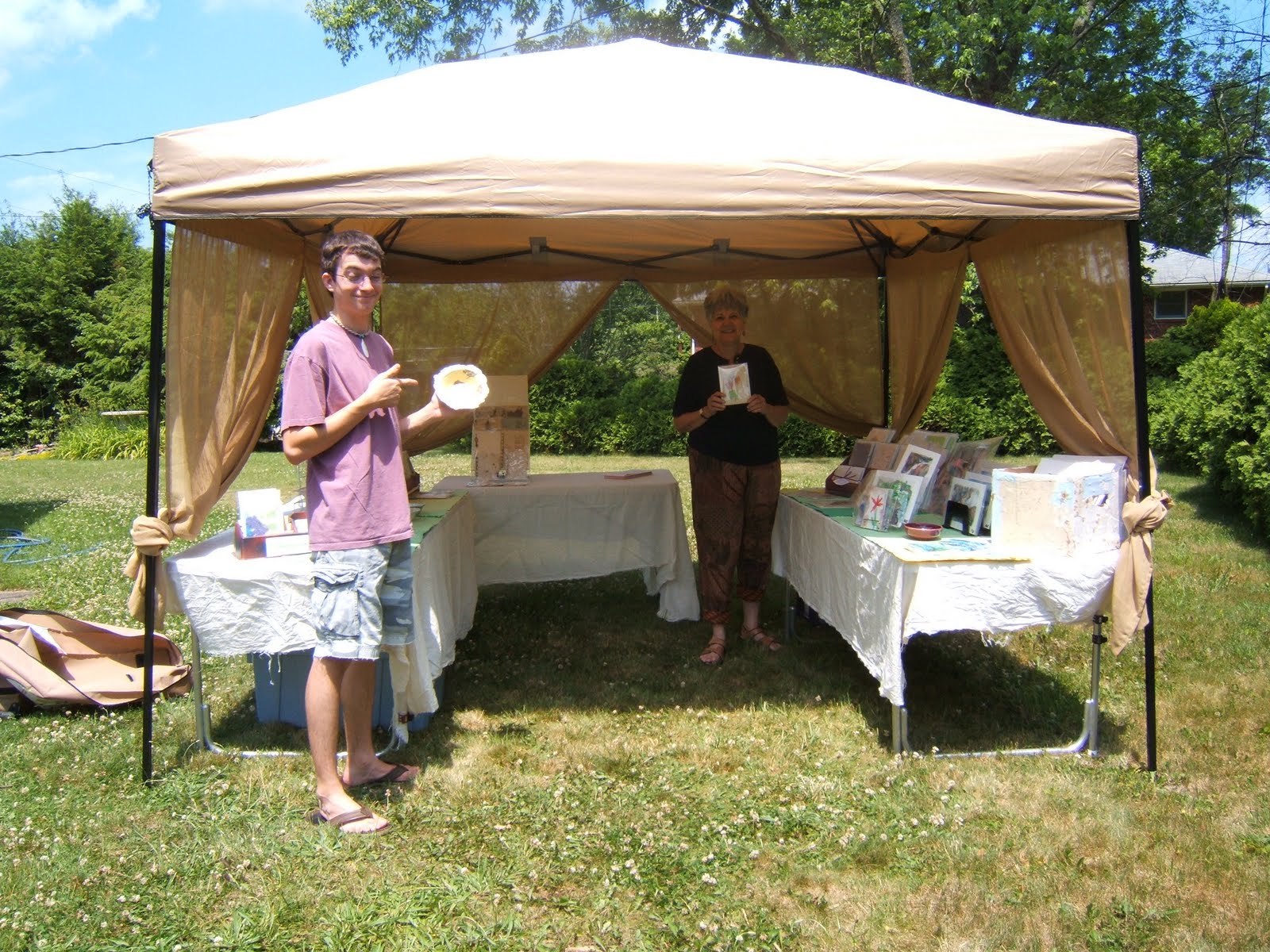 I'm ready for the craft fair season. I talked about buying an easy-up type tent from Walmart earlier. Then I went to yard sales and found my drapes and table cloths. My son, Ashby, made the table toppers out of paper and I already had the different displays.